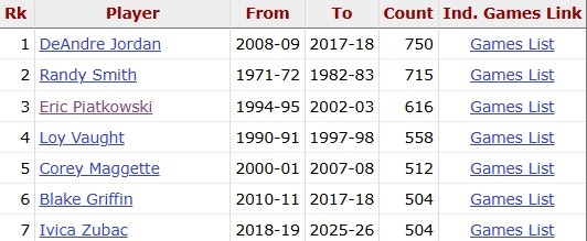据统计,这是祖巴茨代表快船出战的第505场,超越格里芬(504),独享队史第6多。